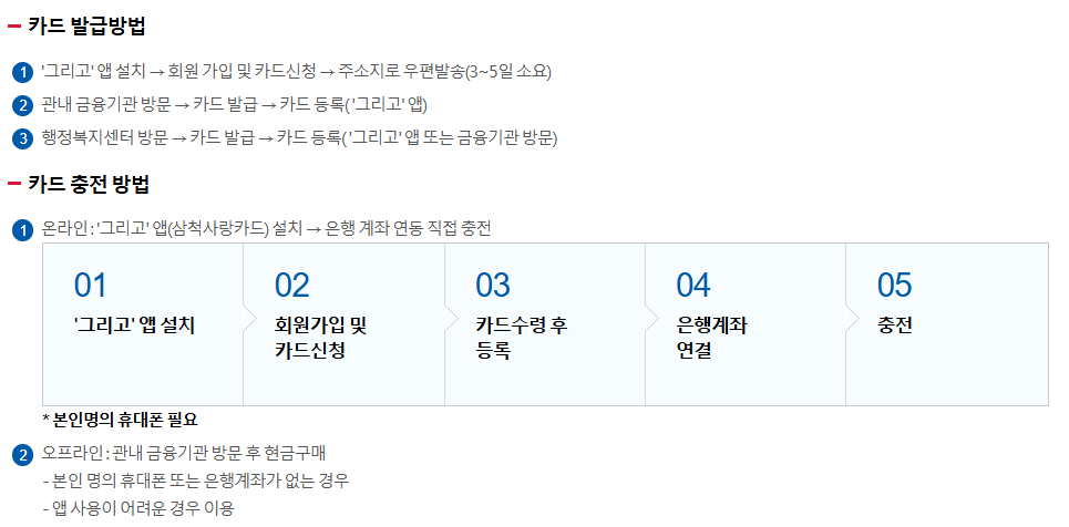 - 온라인: ‘그리고’ 앱 → 회원가입 → 삼척사랑카드 선택 → 발급 신청