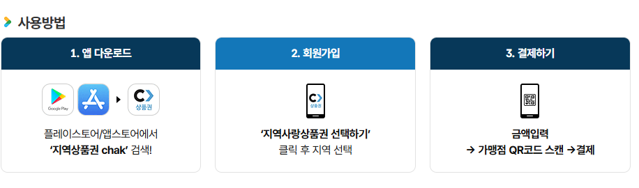 구글 플레이스토어나 앱스토어에서 "지역상품권 chak" 검색해서 받으시면 돼요.